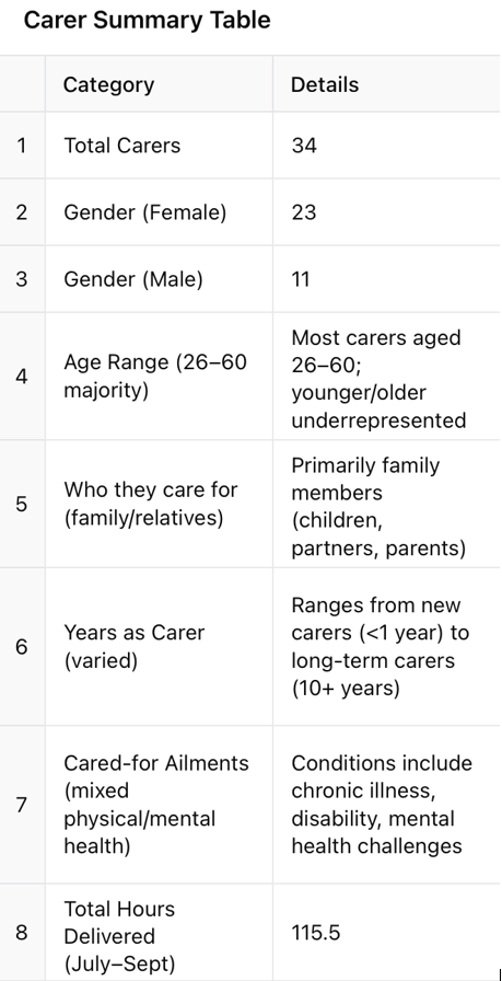 We are mindful that Quarter 1 engagement, while strong, has been demographically concentrated. In Q2, we will actively seek out partnerships with organisations supporting Carers from different communities and age groups. For example, outreach will specifically target young adult Carers (17–25) and transition parent Carers, groups underrepresented in Q1 data.